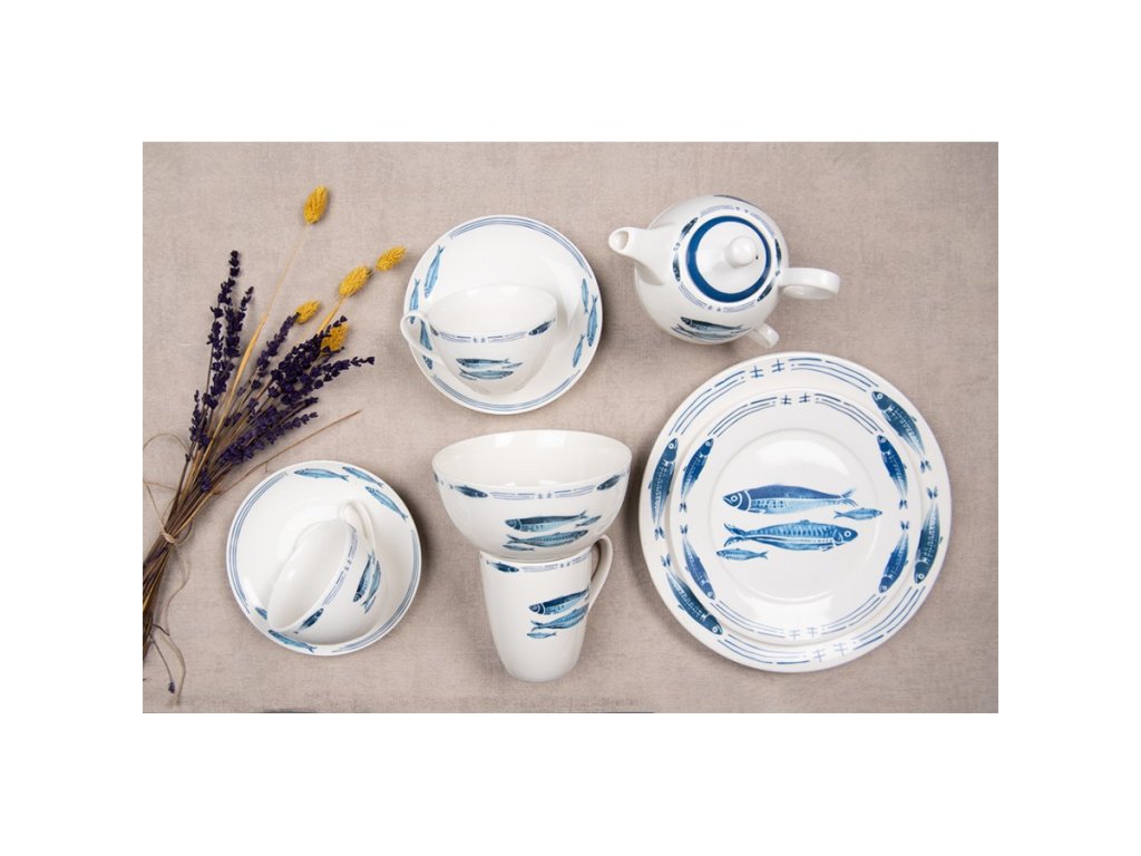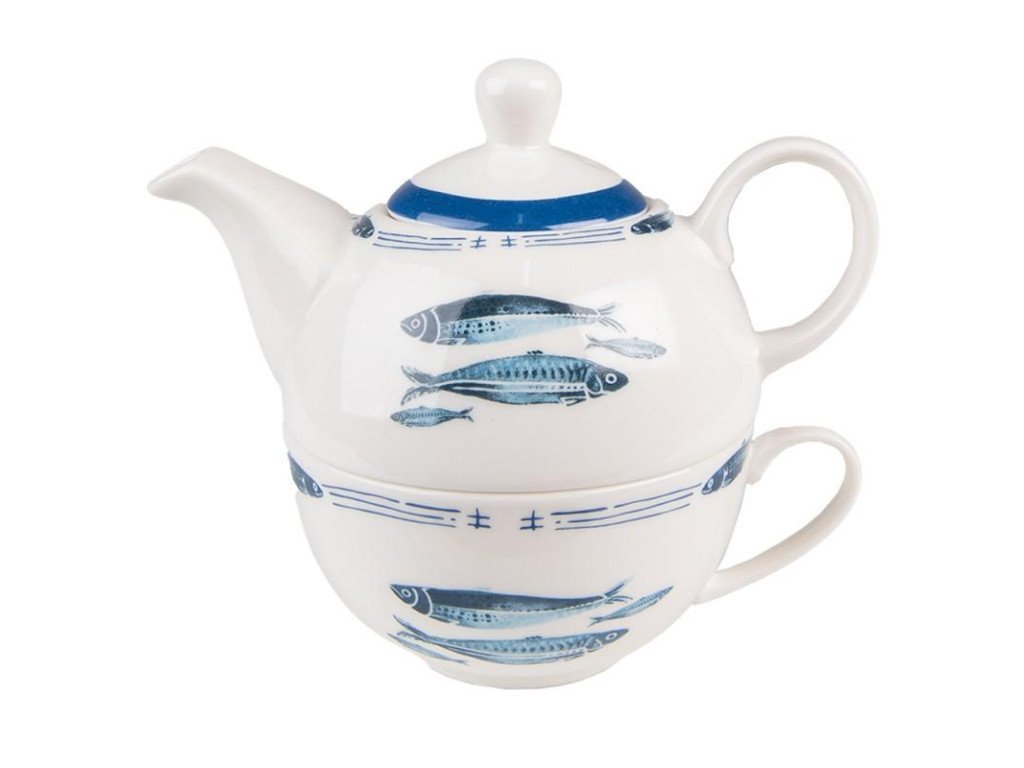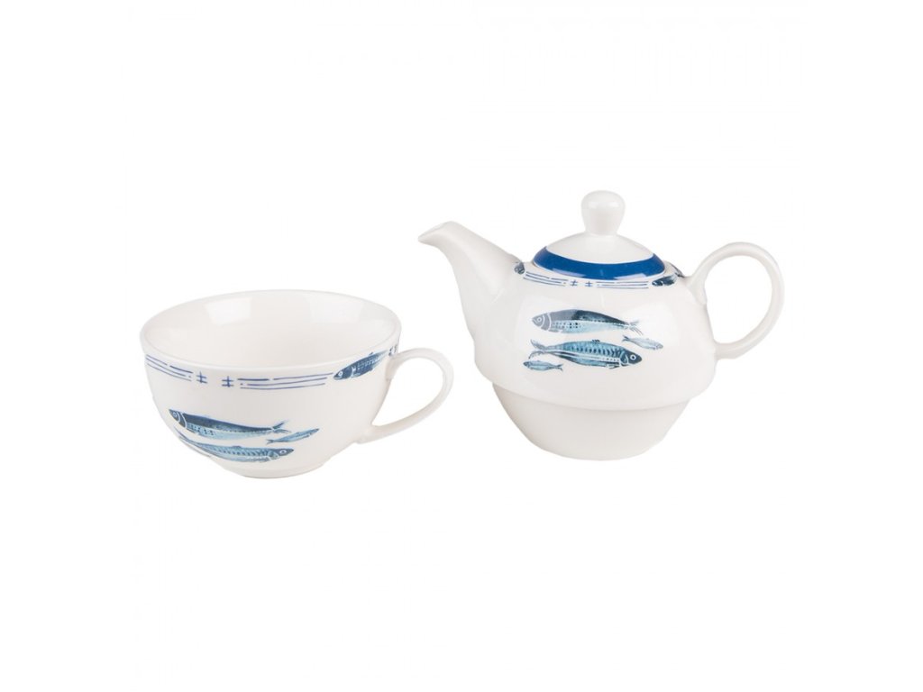 Krásná porcelánová čajová souprava pro jednoho z kolekce FISHY BLUE. Objevte hravý půvab této série nádobí, kde každý kus zdobí vesele malované ryby v krásném modrém odstínu na svěže bílém podkladu. Tato námořní kolekce dodá vašemu stolu nádech mořského dobrodružství.