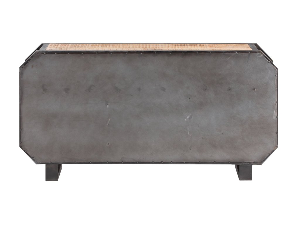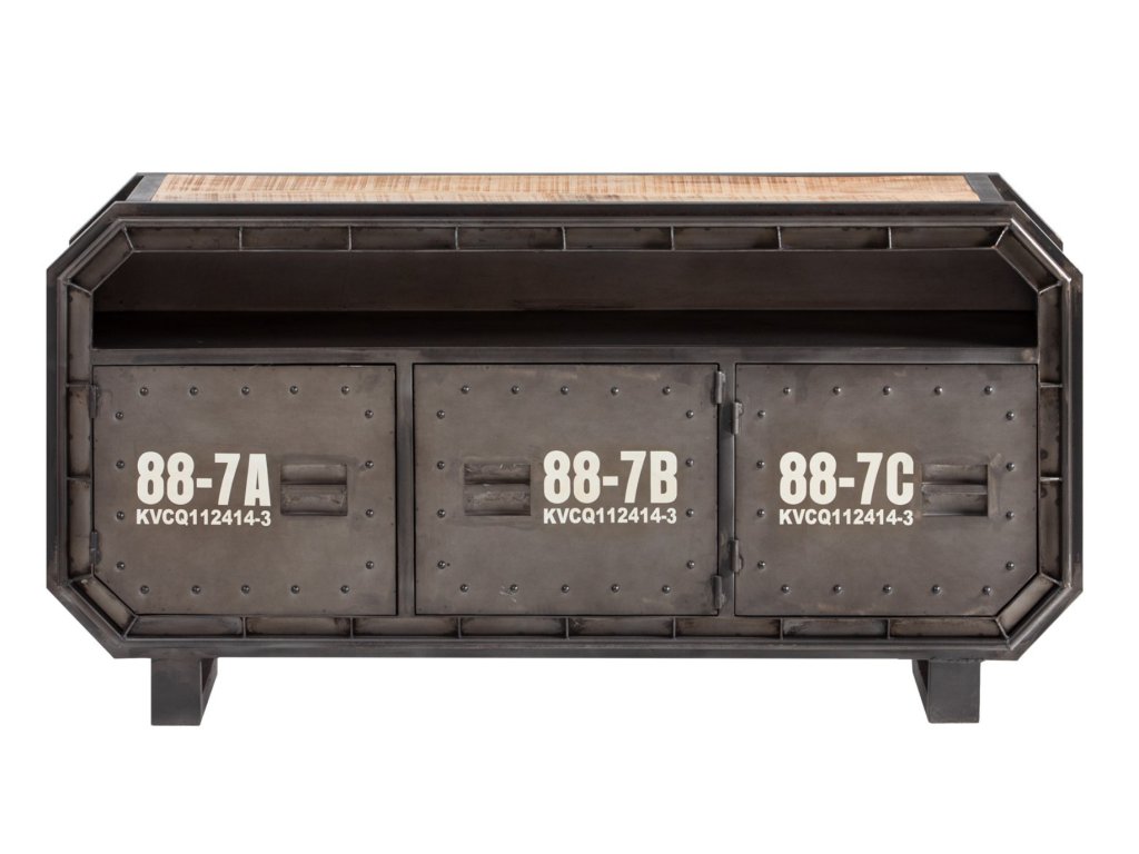 Design je skutečně poutavý: rustikální kov se setkává s elegantním mangovým dřevem . Výsledkem je výrazný kus nábytku, který je robustní a zároveň vyzařuje styl. Troje dvířka a otevřený prostor jsou super praktické a stylové potisky dělají z televizního stolku nezapomenutelný poutač.