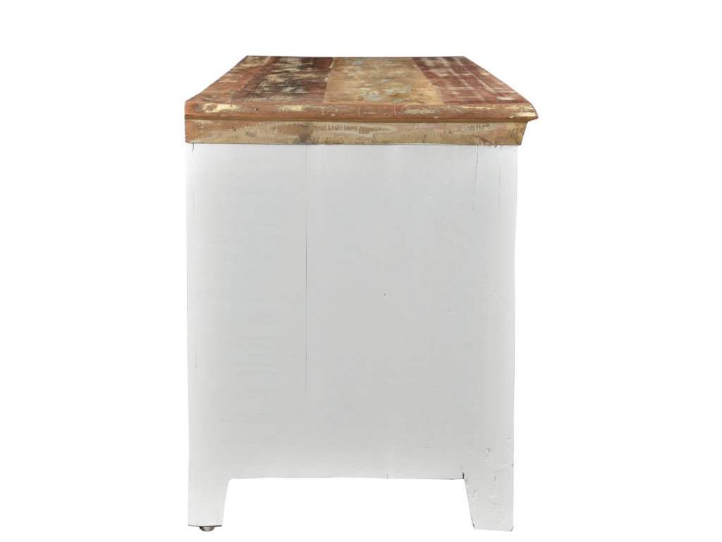 Nada nábytku Makani Wai evokuje plážové sny a vzpomínky na dovolenou v těch nejkrásnějších barvách. Zachytili jsme je a zkombinovali se světlým nábytkem Nábytek je vyroben z recyklovaného dřeva, jako je mango, teak a akácie – a pochází převážně z oken a dveří starých indických budov. Chtěli jsme zachovat právě tento barevný aspekt a zároveň zdůraznit různé dřevěné struktury. Proto jsme odstranili některé barvy a odhalili dřevěný tón pod nimi. V kombinaci s bílým korpusem jsme vytvořili sérii, kterou bychom rádi viděli v mnoha koupelnách jako „malý suvenýr“ z jižní polokoule. Touto sadou chceme znovu ukázat, že náš nábytek je skutečně ručně vyráběný. Každý kus je jedinečný, má své vlastní charakteristické barevné schéma. A každý jedinečný kus má svůj vlastní příběh Funkční a stylovýTento televizní stolek poskytuje skvělý úložný prostor pro váš televizor a další předměty. Disponuje otevřenou přihrádkou na přístroje, zásuvkou a dalšími úložnými přihrádkami za dvířky. Zároveň je tento televizní stolek vizuálně působivý – díky svému osobitému designu zaručeně upoutá pozornost. Jednotlivé kusy jsou ručně vyrobeny na vysoké úrovni a každý má svou vlastní historii a barevné schéma. Díky tomu je každý televizní stolek jedinečný. Poznámka: Rustikální vzhled je záměrný! Bílé dřevěné povrchy jsou záměrně nerovnoměrně natřeny. Odštěpky, díry a nerovnosti jsou součástí designu a přispívají ke zvláštnímu starožitnému vzhledu. Nejedná se o vadu, ale o úmysl!