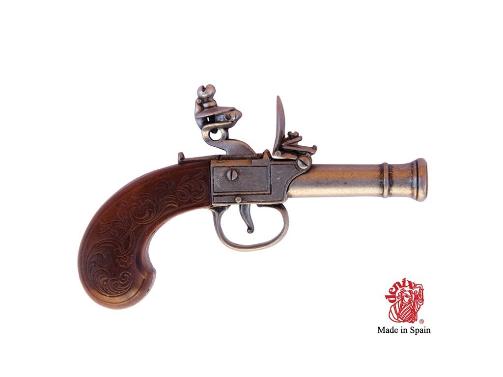 Malá kapesní pistole s křesadlovým zámkem, jejíž originál byl vyroben kolem roku 1770 v Londýně firmou Bunney. Povrchová úprava kovu šedá