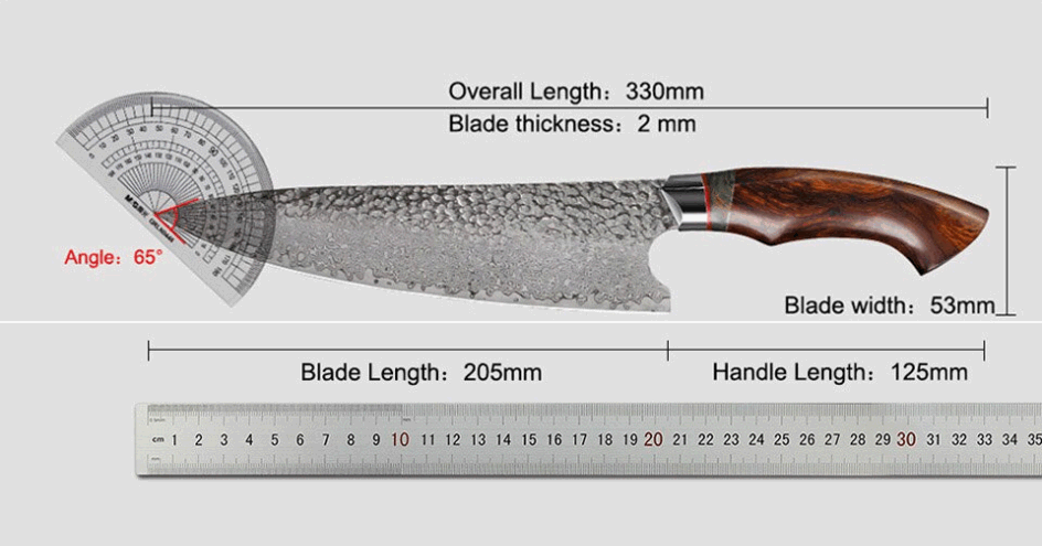 | Rukojeť: z tvrdé dřeviny "American desert ironwood" ručně leštěno do vysokého lesku | Délka čepele: 205 mm |