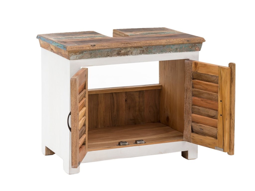 Skříňka pod umyvadlo Makani Wai - Praktická, a přitom stylová! Podrobnosti:Vnitřní rozměry ŠxVxH: 61x46x37 cm Poznámka: Rustikální vzhled je záměrný! Bílé dřevěné povrchy jsou záměrně nerovnoměrně natřeny. Odštěpky, díry a nerovnosti jsou součástí designu a přispívají ke zvláštnímu starožitnému vzhledu. Nejedná se o vadu, ale o úmysl!
